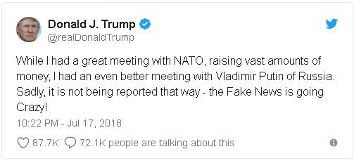 美国总统川普与俄罗斯总统普京在芬兰赫尔辛基举行联合记者会后互动。(2018年7月16日) 他说:“在我讲话中有一个关键的句子,我说了‘会是’,而不是‘不会是’。那句话本应是‘我看不到任何不会是俄罗斯的理由’。” 川普总统星期二继续声称媒体曲解了他出访期间的讲话。
